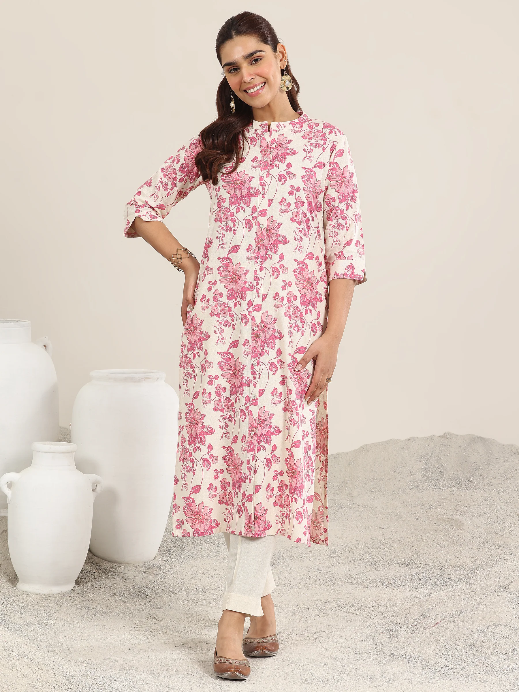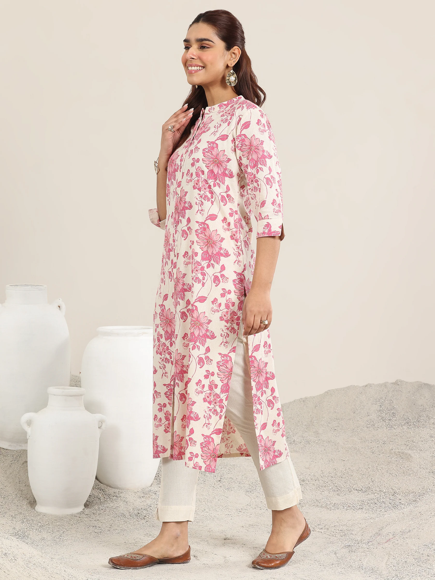 Pink Printed Cotton Straight Kurta